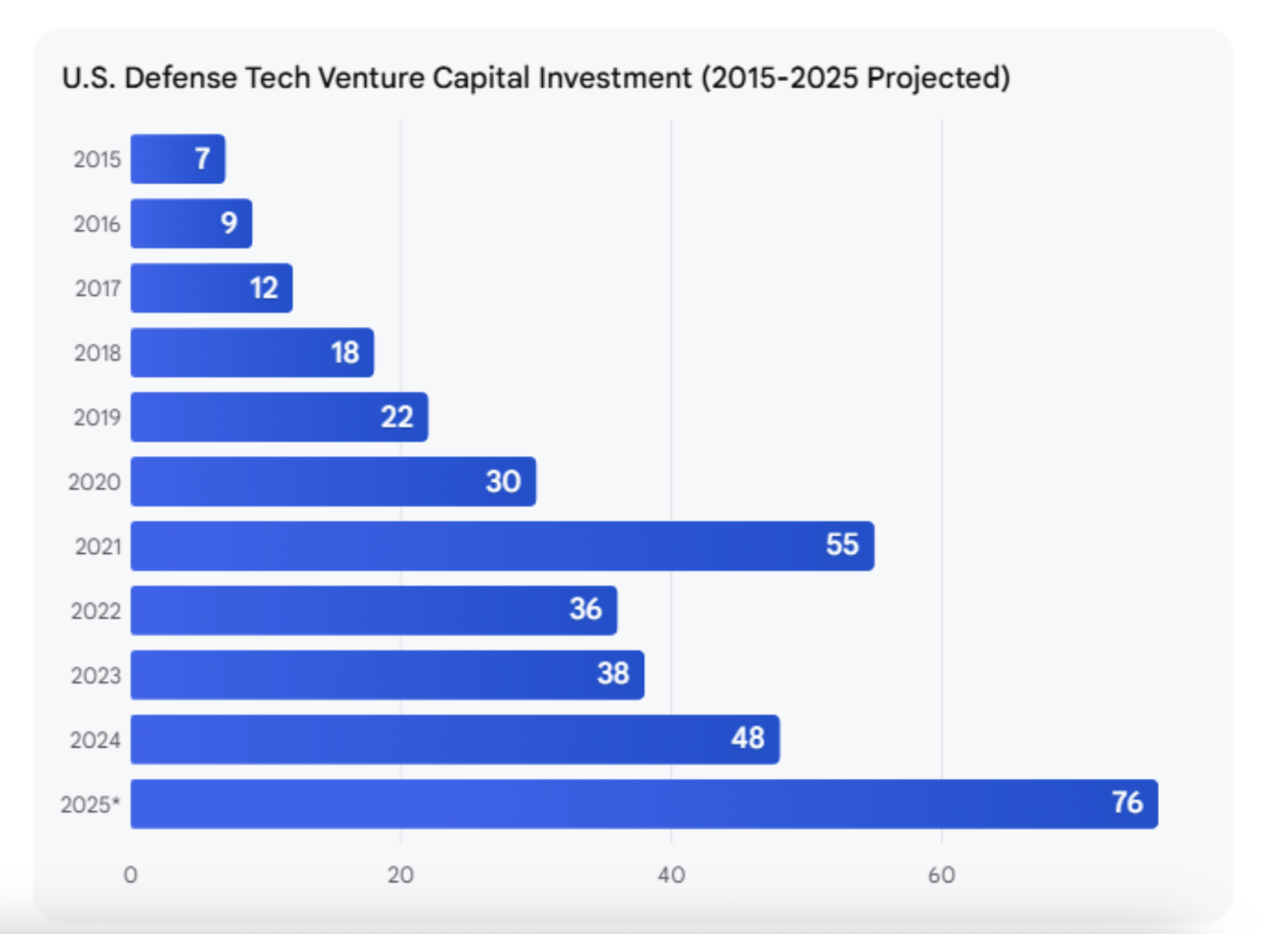 The chart below illustrates the robust growth in U.S. defense technology VC investment, which has remained resilient and grown significantly since 2015. It is on track to potentially exceed its $55 billion peak in 2021 with a projected $76 billion for the full year 2025.